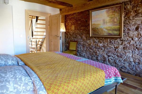 Im Obergeschoss zwei Schlafzimmer für jeweils 2 Personen : das kleinere mit Doppelbett, Natursteinwand, altem Spiegel und Balkon nach Südwesten, das grössere mit zwei Einzelbetten, dazwischen ein geräumiges modernes Bad (9 qm) mit Kautschukboden und grosszügig zugeschnittener Regendusche. (120 x 90 cm).