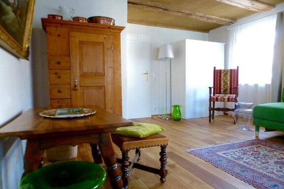 Am Dorfbrunnen im historischen Ortskern von Lipburg gelegen, begrüsst Sie das markante Haus Zur Alten Dame. Treten Sie ein! Sogleich umfängt Sie ein Gefühl von Geborgenheit in dem lichtdurchfluteten Haus. Eine Mélange aus alten und modernen Möbeln erwartet Sie auf drei Etagen. Im Erdgeschoss sitzen Sie an einem alpenländischen Esstisch, umgeben von regionalen und italienischen Möbeln, einem Kachelofen, Künstler-Bildern, Kerzenleuchtern und Dekorationsstücken, die immer wieder zu Entdeckungsreisen innerhalb des Hauses einladen. So wird das Wohnen zum Erlebnis.